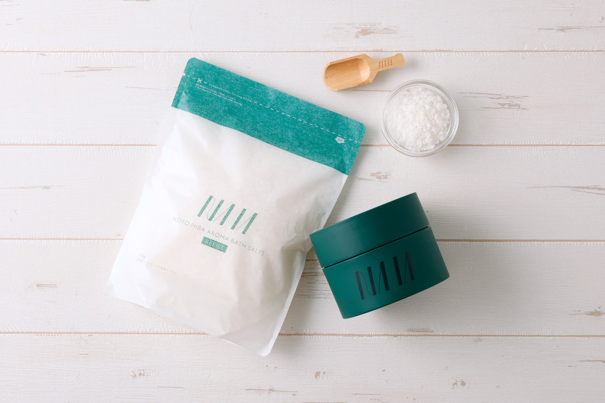 揚げ浜塩、能登ヒバ。