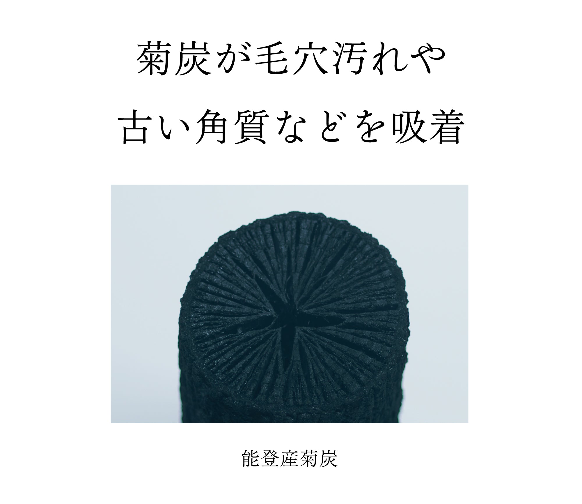 *菊炭:炭(汚れ吸着成分)*能登産熟成酒粕パウダー:酒粕(保湿成分)