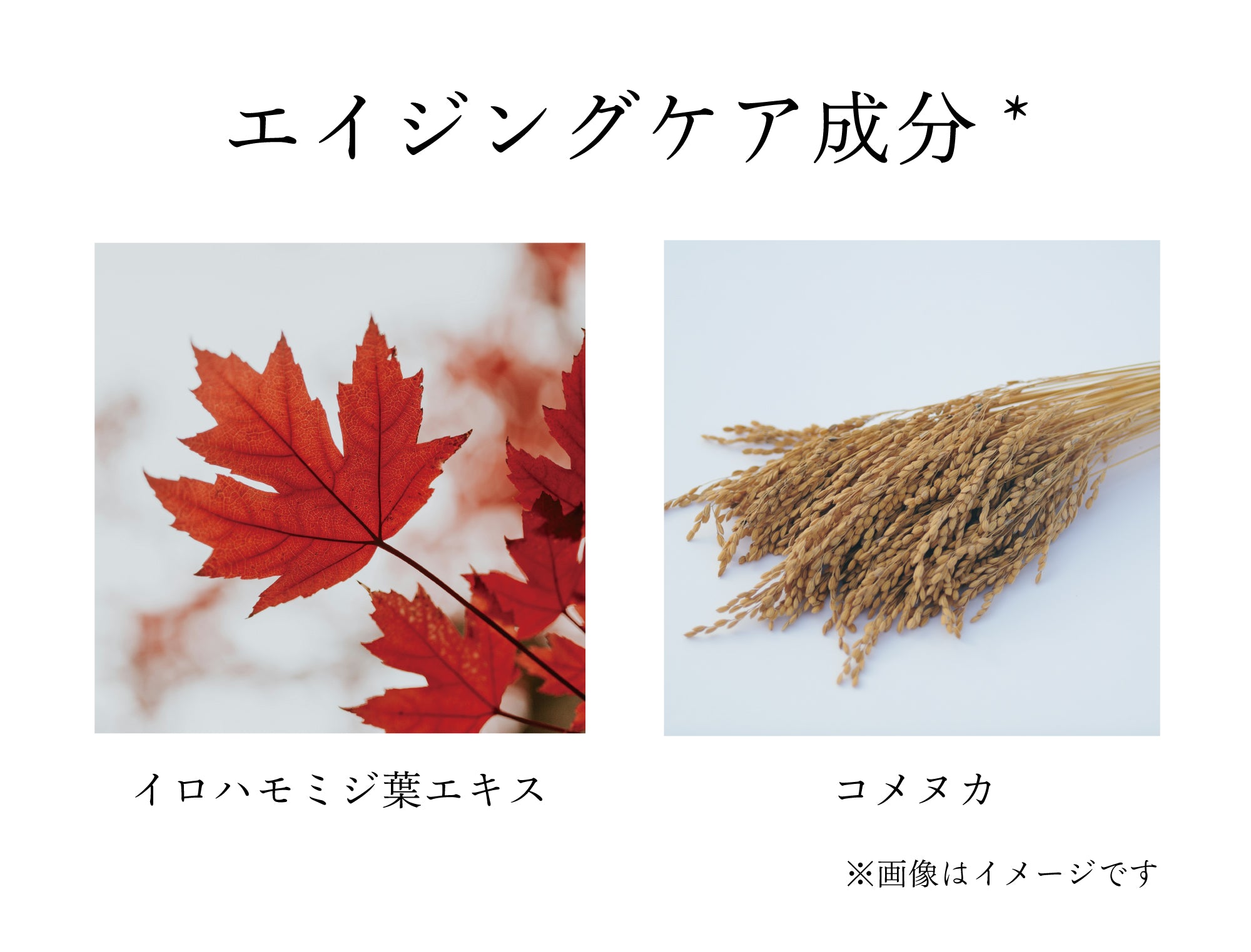 エイジングケア成分*として自社有機米から抽出した能登産コメヌカエキス*、フェルラ酸*、イロハモミジ葉エキス*などを配合