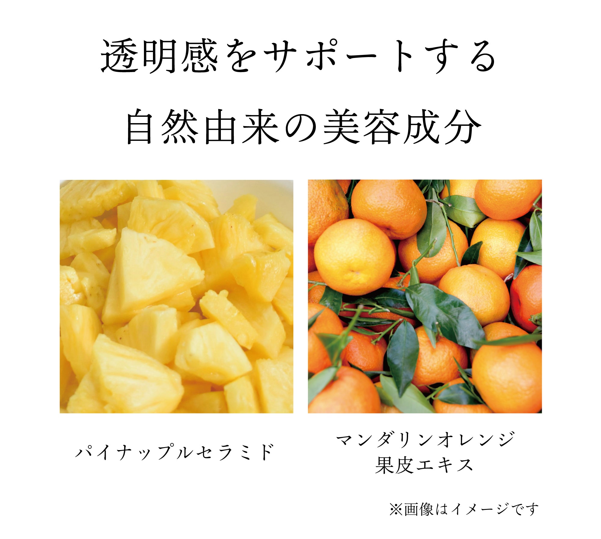 透明感をサポートする成分としてパイナップルセラミド*とマンダリンオレンジ果皮エキス*を贅沢に配合