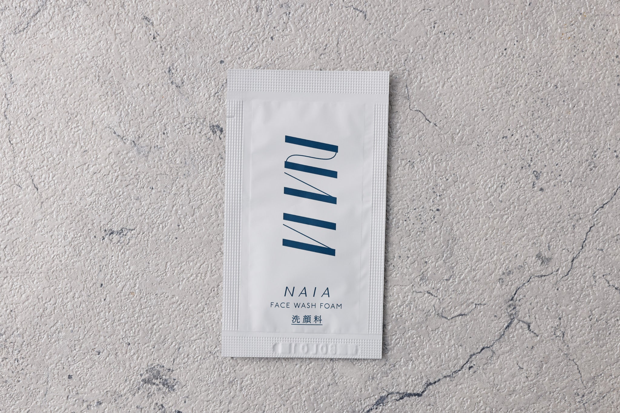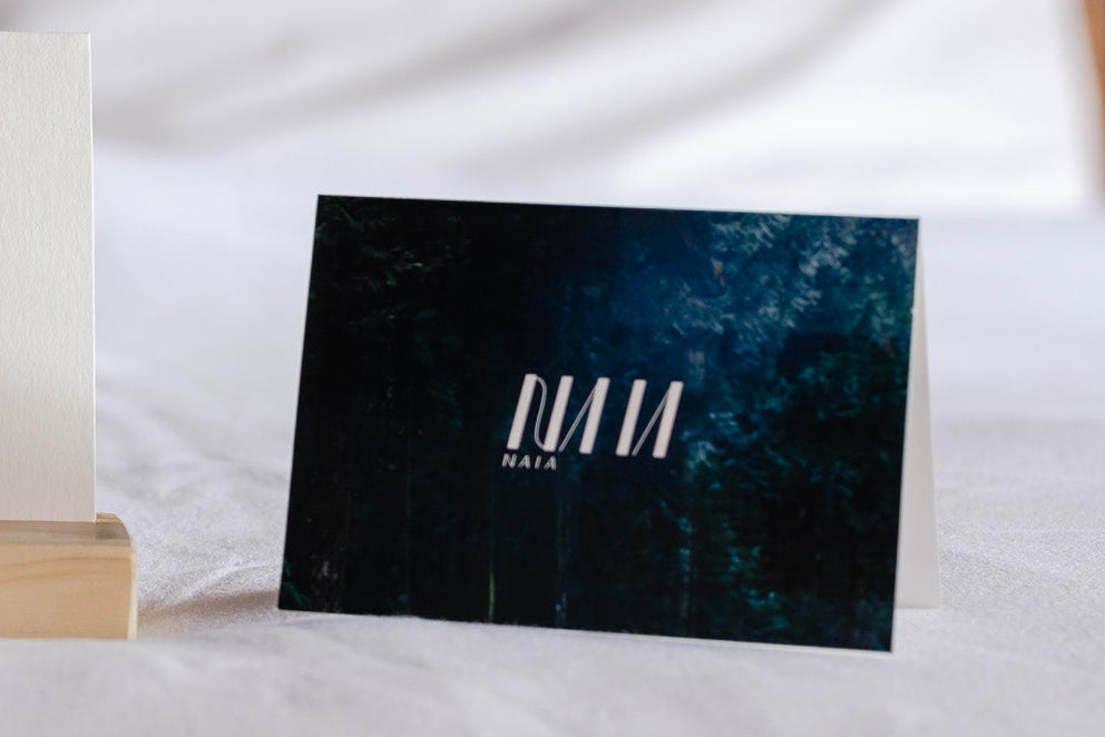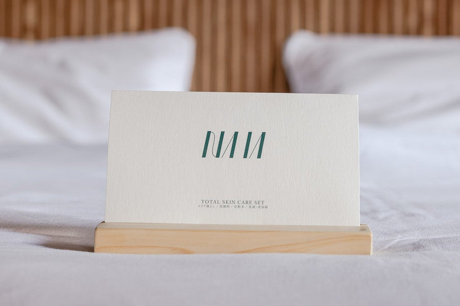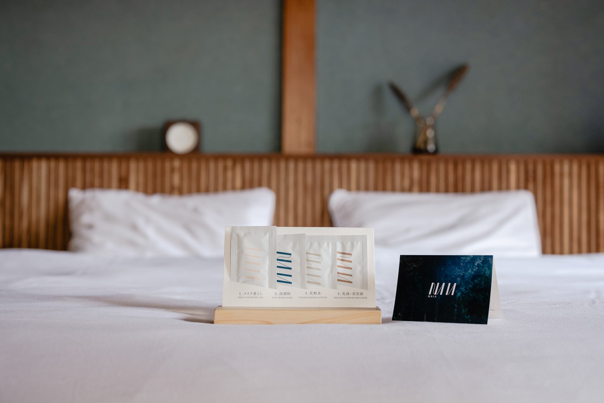 アメニティに添える、NAIAのブランドカード。自然素材を大切にする姿勢を、ゲストへ静かに伝えます。